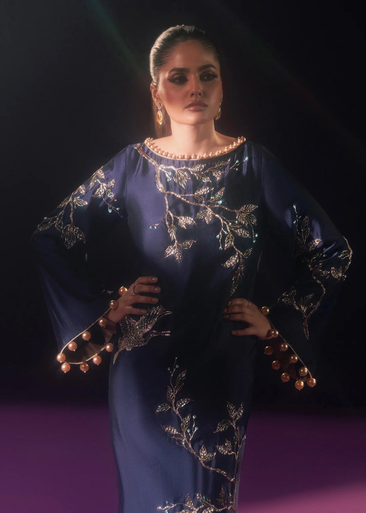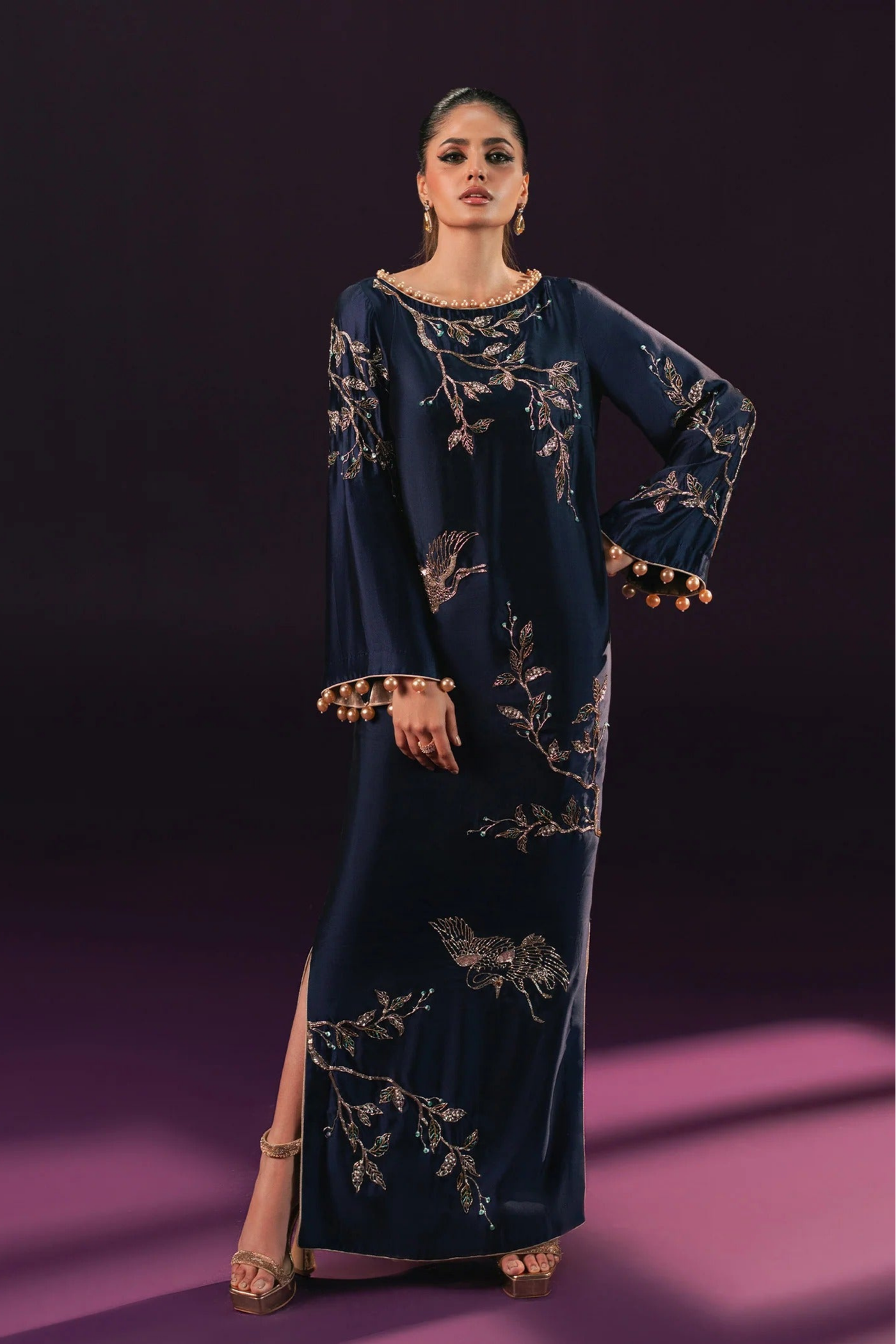 A full-length midnight blue sheath dress crafted in dip-dyed tissue silk, adorned with chinoiserie-inspired hand embroidery and pearl-edged sleeves for an elegant, opulent look.