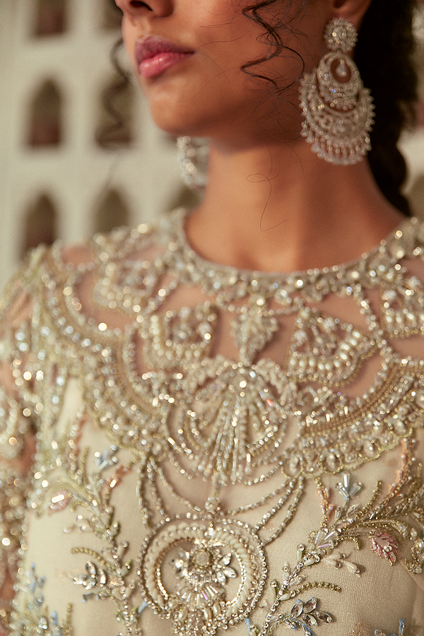 An ivory long shirt paired with ice blue organza dupatta and ivory raw silk trousers, adorned with delicate pearl and gold handwork for a regal and elegant look.