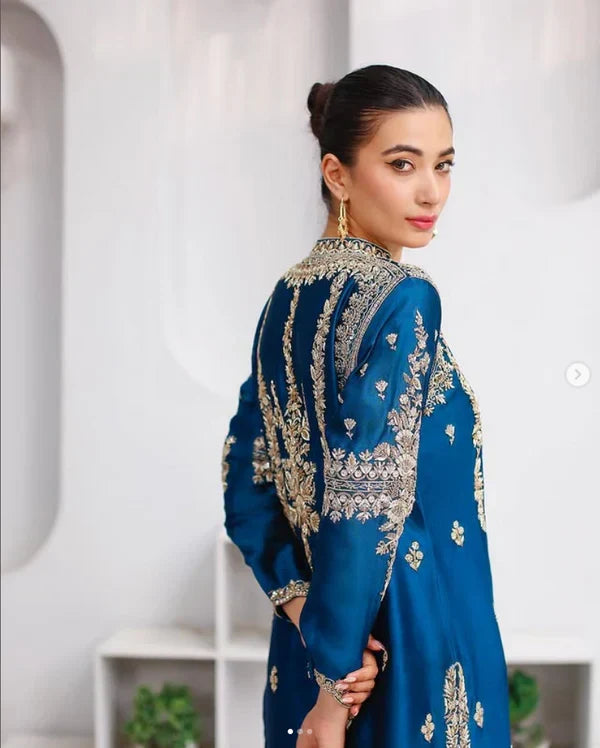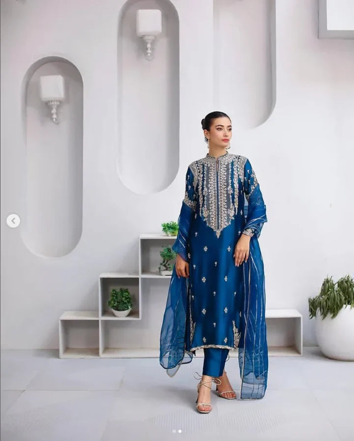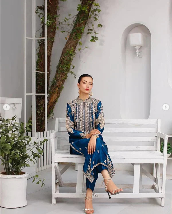 A stunning navy blue ensemble adorned with intricate silver embroidery flowing from the neckline to the sleeves, creating a graceful fusion of tradition and modern charm. Paired with straight pants, this outfit is perfect for festive occasions or formal gatherings.