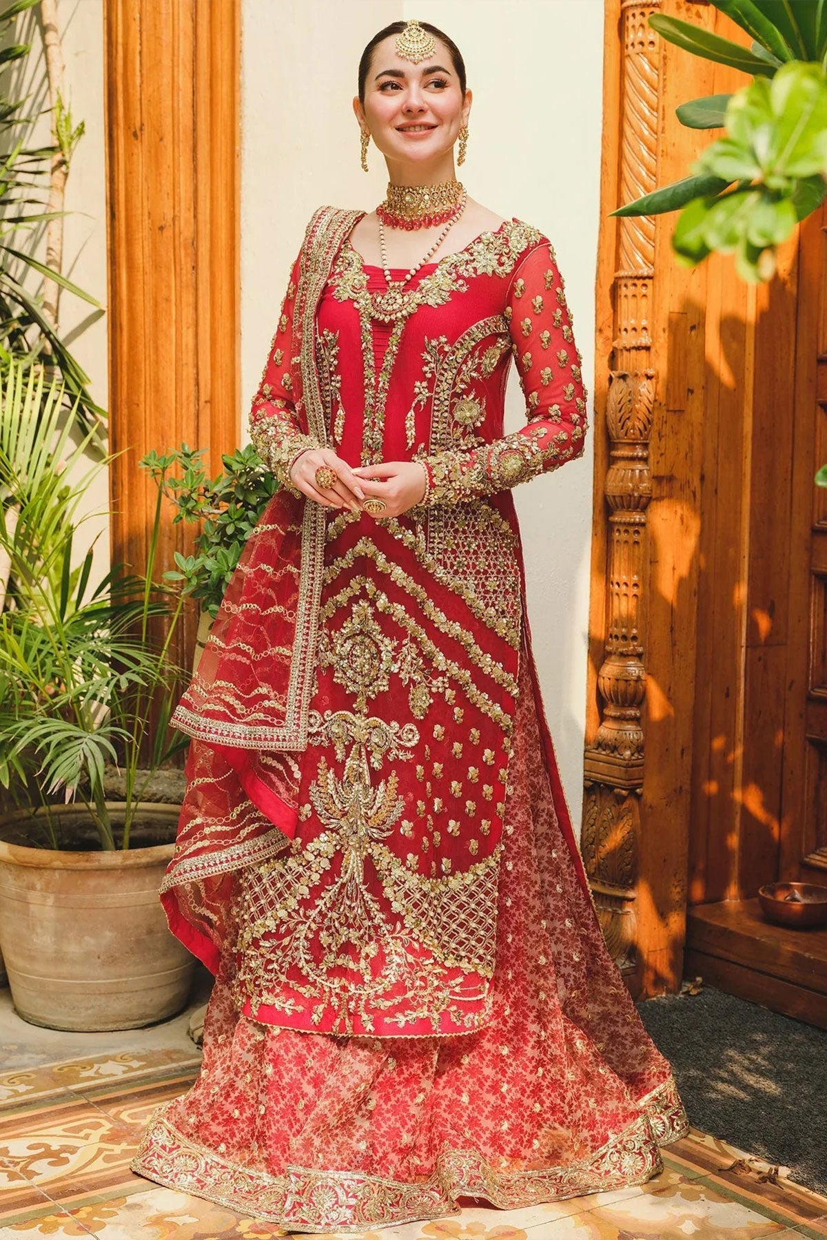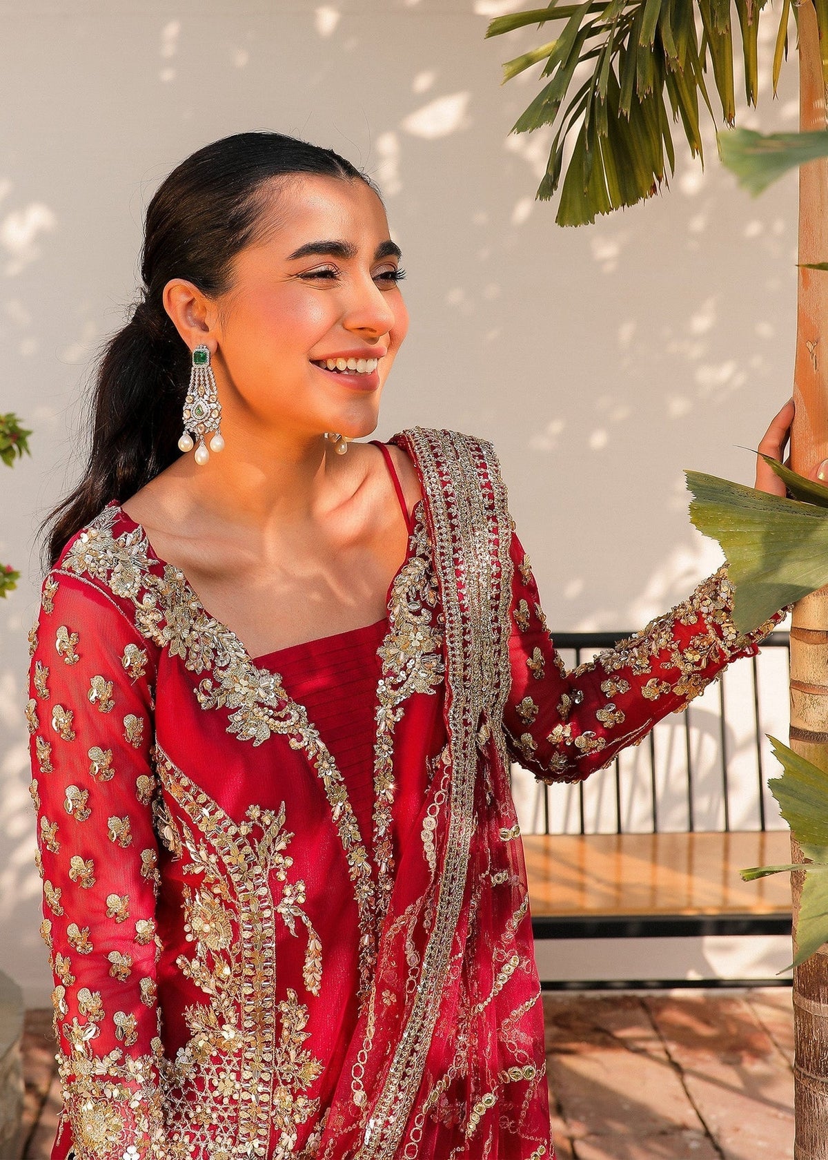 A captivating red ensemble adorned with intricate tilla embroidery, gota patti, pearls, and champagne crystals. The beautifully detailed dupatta and printed sharara bring a regal touch, ideal for festive or bridal occasions.