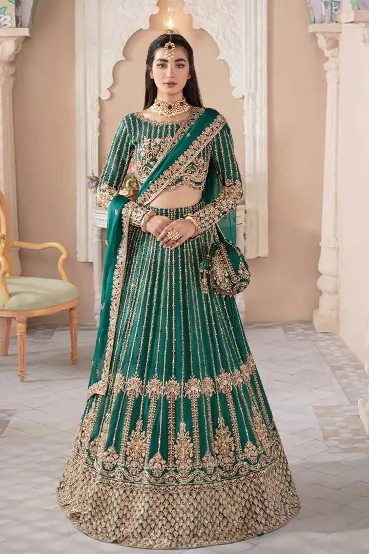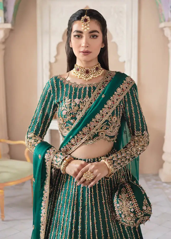 A vision of elegance in forest green, Fariza captures the magic of linear artistry and captivating embellishments. Crafted from premium Korean silk, the timeless silhouette features delicate floral and lined motifs. The lavishly adorned lehnga showcases exquisite handwork, while the organza dupatta, detailed with sequin spray and ornate borders, adds a refined touch - making this ensemble perfect for festive celebrations.