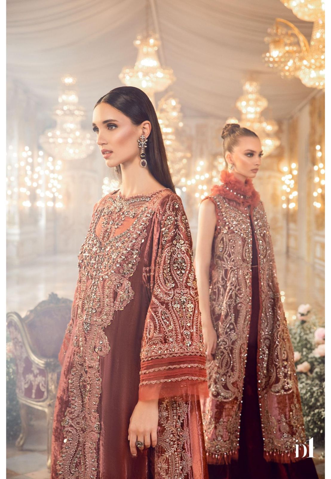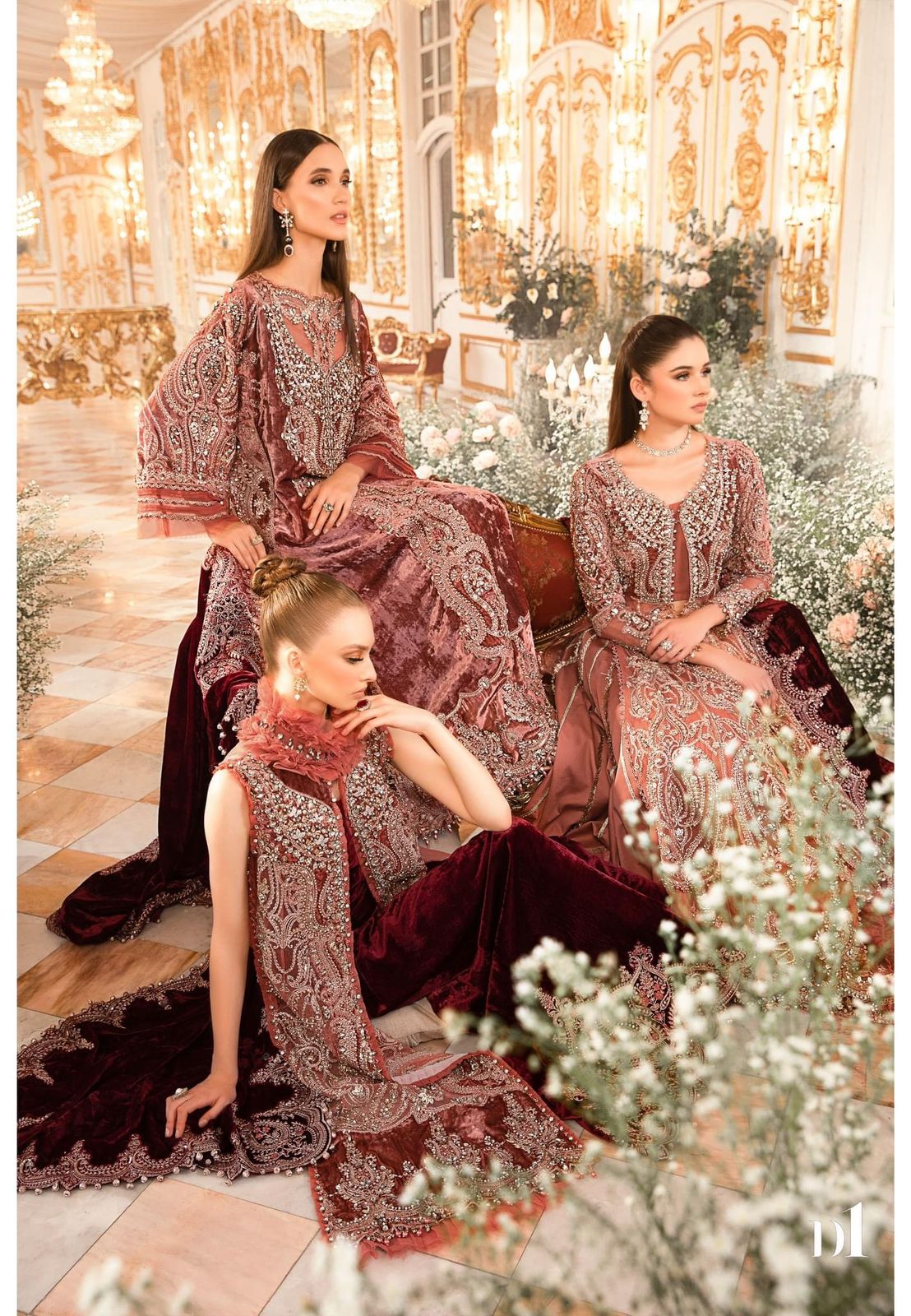 A graceful blend of organza and jamawar, “Salmon Pink BD” radiates wedding elegance with its soft salmon tone. The four-piece ensemble showcases intricate applique artistry and detailed handwork, paired with a rich velvet shawl for a luxurious finish.