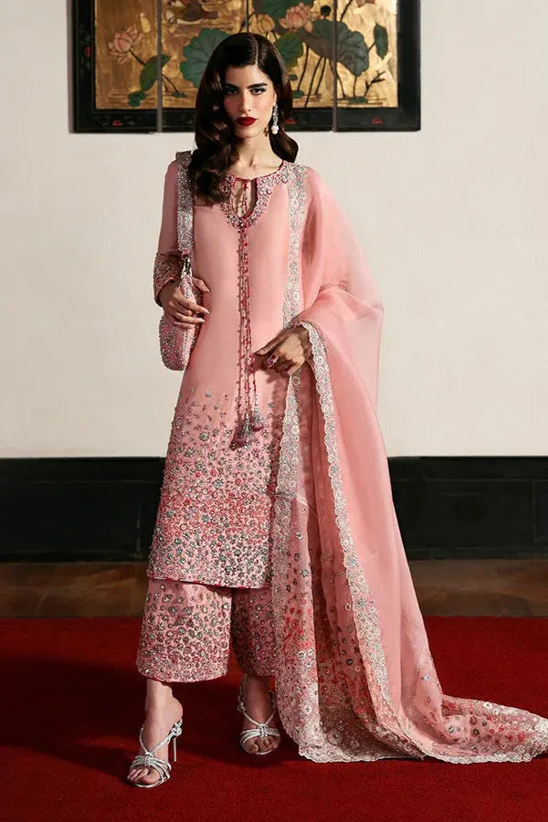 Exude elegance with this blush pink ensemble crafted from luxurious raw silk and organza. The shirt features delicate floral embroidery in soft gradient tones, accented with silver sequins and intricate hand embellishments. Fitted sleeves echo the shirt’s floral motifs for a refined look. Paired with matching raw silk culottes and a pure organza dupatta embroidered along all four sides, this outfit is perfect for festive and formal occasions.