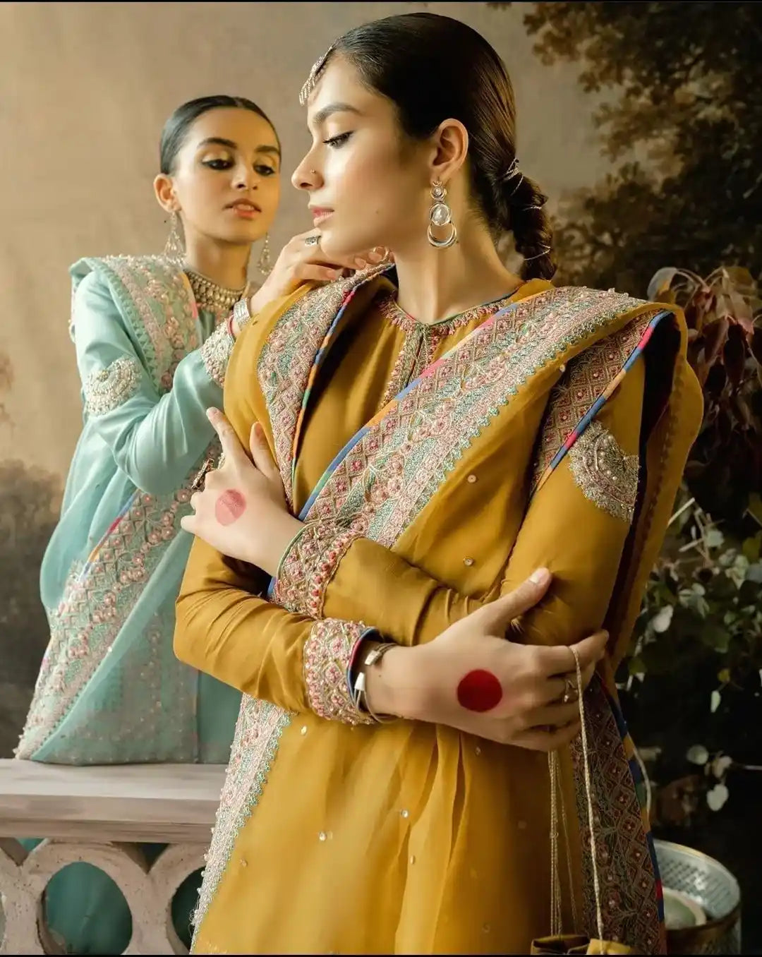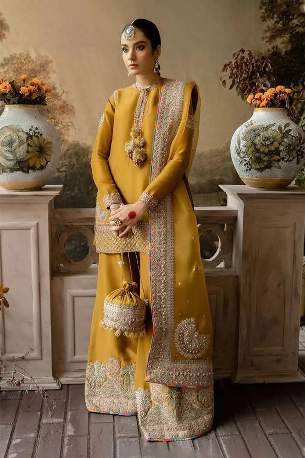 A graceful mustard raw silk ensemble featuring delicate multi-colored embroidery and golden handwork on the neckline, sleeves, and borders. Paired with a matching raw silk plaza and an organza dupatta bordered on all sides with a soft spray, this outfit beautifully blends elegance with timeless charm.