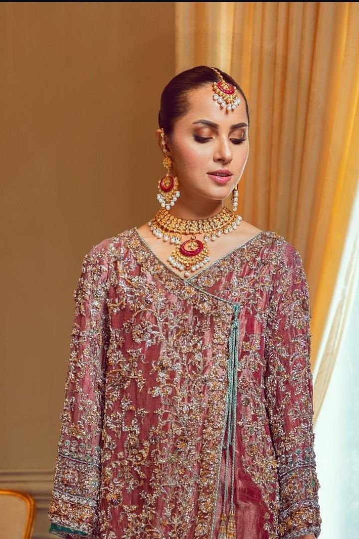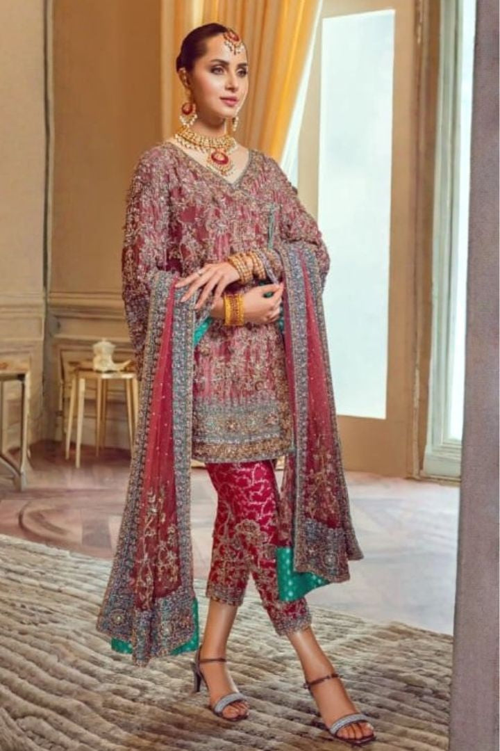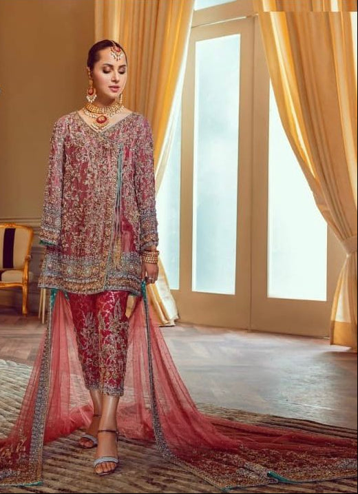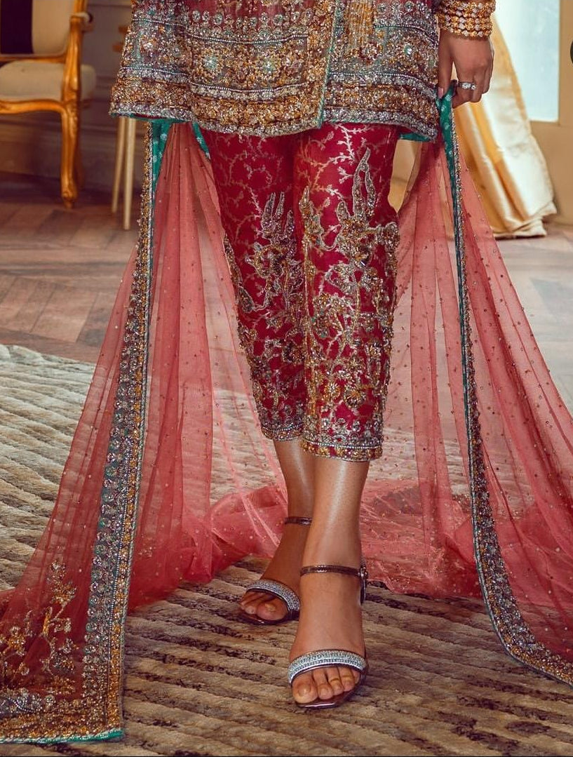 Step into the spotlight with this masterpiece from our luxury festive collection. This ensemble features the ethereal glow of Masori Zari fabric, known for its metallic luster and premium texture. Draped in a regal tea-rose and gold palette, this outfit is designed for the woman who appreciates high-fashion craftsmanship and traditional roots.