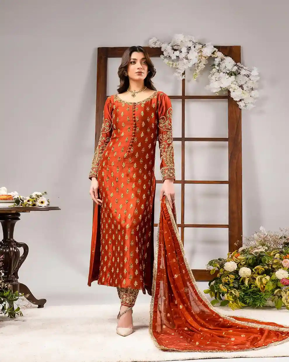Tangerine by Ahmad Sultan is a statement of refined luxury, crafted from premium katan silk. The outfit features intricate hand embellishment on the front and sleeves, highlighting its elegant craftsmanship. Paired with a cotton net embroidered dupatta and a katan silk trouser detailed with a hand-embellished border, this ensemble radiates timeless sophistication and charm.