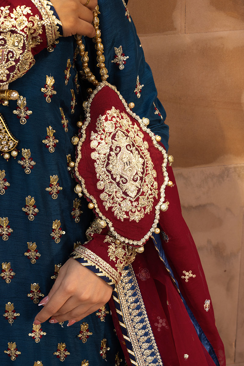 Mahnaz - A portrait of timeless elegance, crafted from Tassel Silk adorned with exquisite handwork, Swarovski, pearls, gotta, and naqshi. Paired with an embroidered Tassel Silk dupatta, it radiates classic allure and festive sophistication.