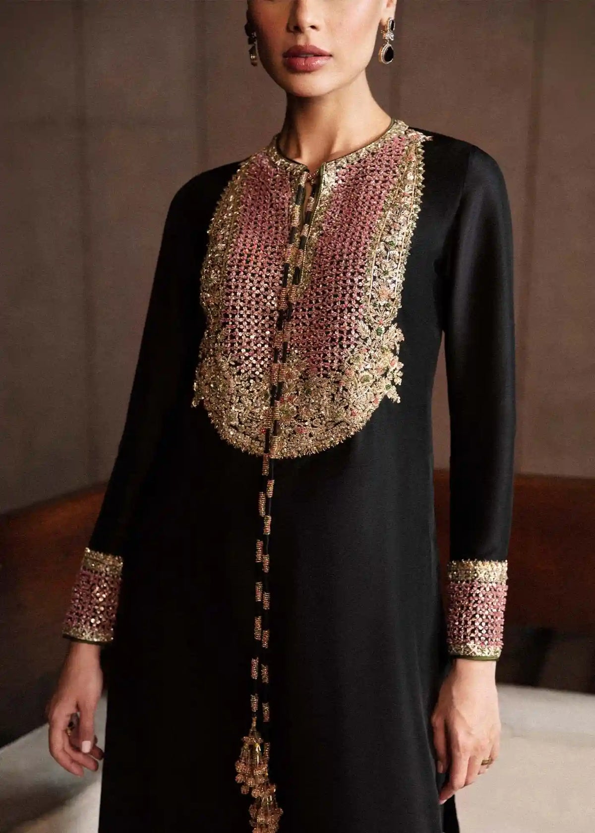- Heavily Embellished Neckline with Tassels