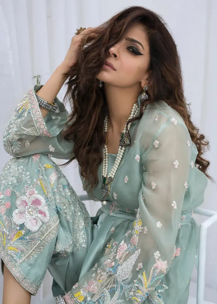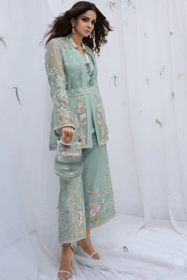 A mint organza wrap jacket paired with raw silk pants, adorned with detailed embroidery and handcrafted accents. Optional organza dupatta completes the elegant ensemble.