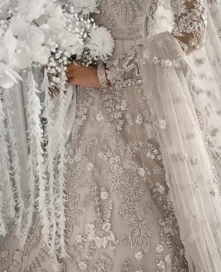 A modern, glamorous ensemble in net and silk, featuring intricately hand-detailed embroidery and patterns. Designed for elegance and sophistication, perfect for festive events, weddings, or special occasions.