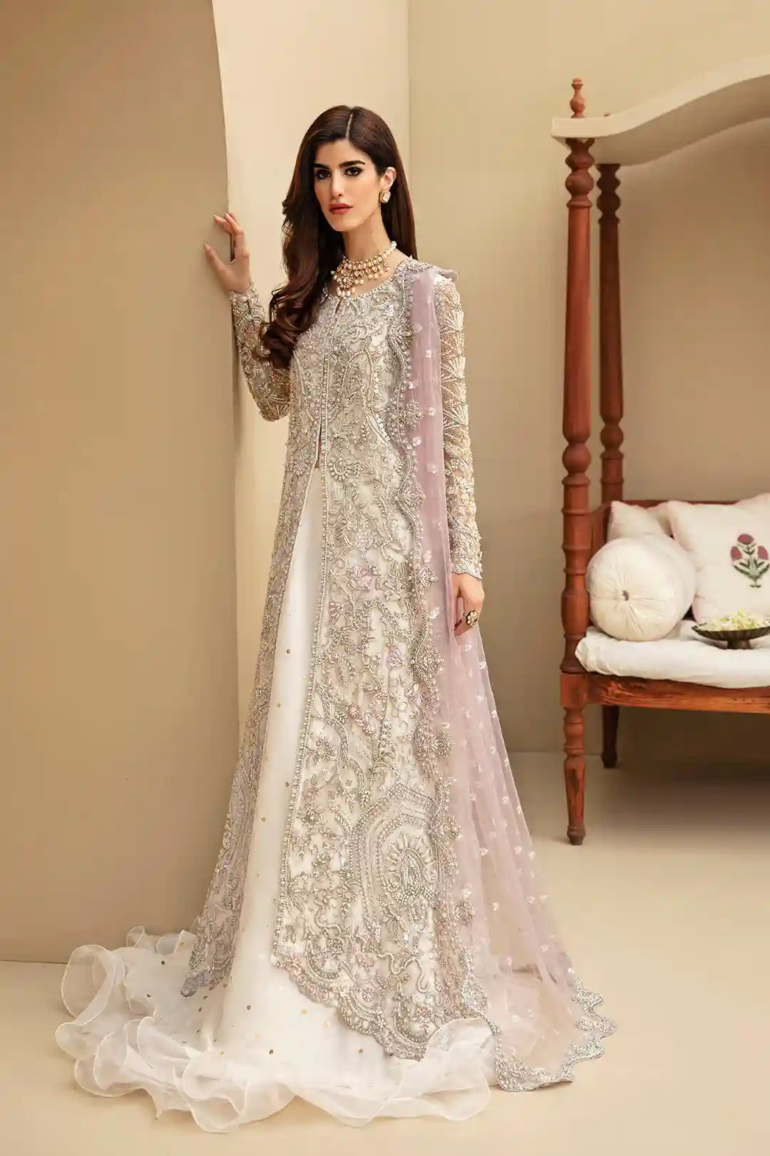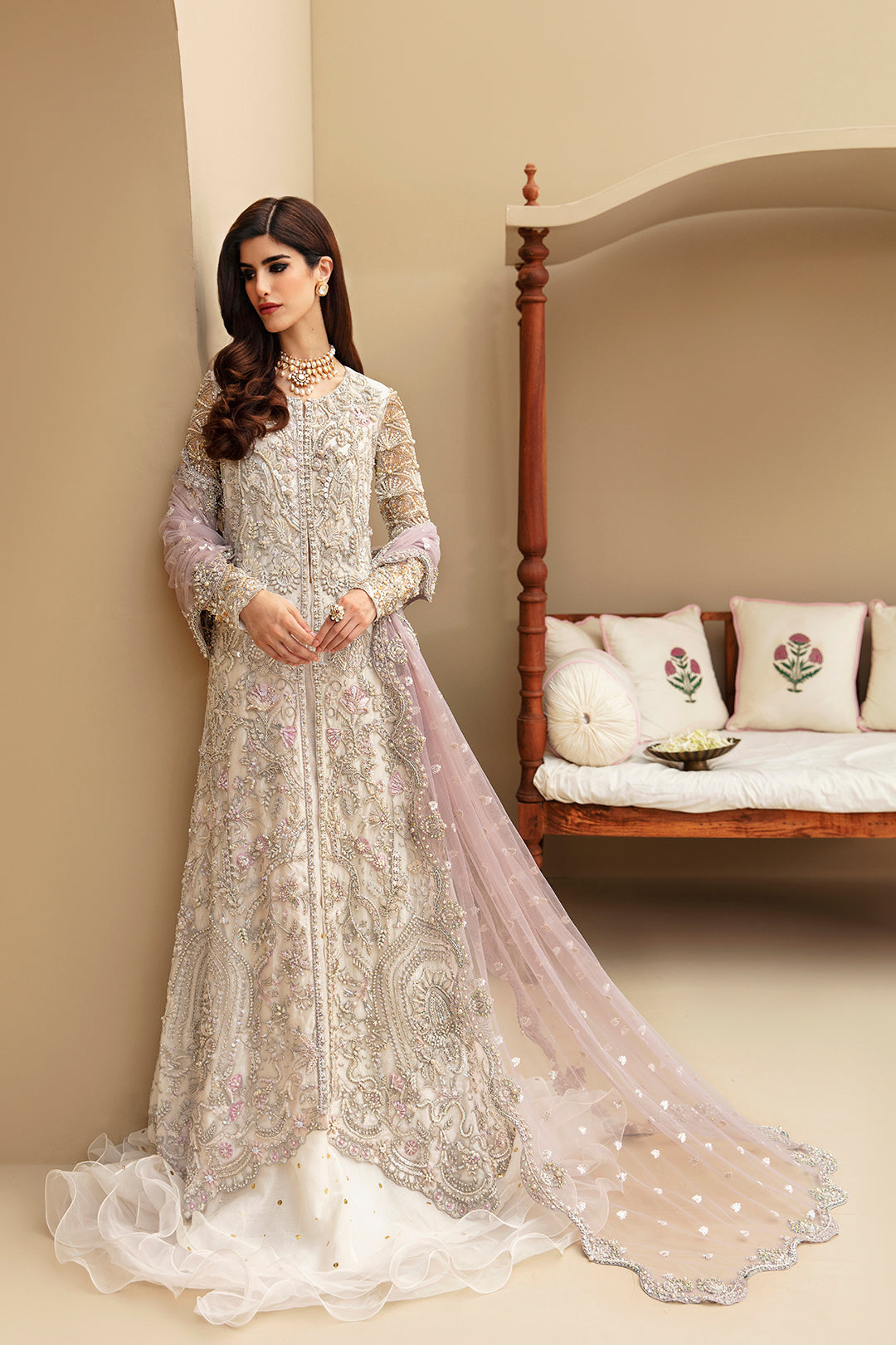The Sophea from Mysie by Tahir is a captivating ivory wedding ensemble crafted from net fabric with intricate embroidery. Expertly designed, it exudes elegance and sophistication, making it a perfect choice for brides seeking a refined and luxurious look. Every detail highlights meticulous craftsmanship, ensuring a graceful and confident presence on your special day.